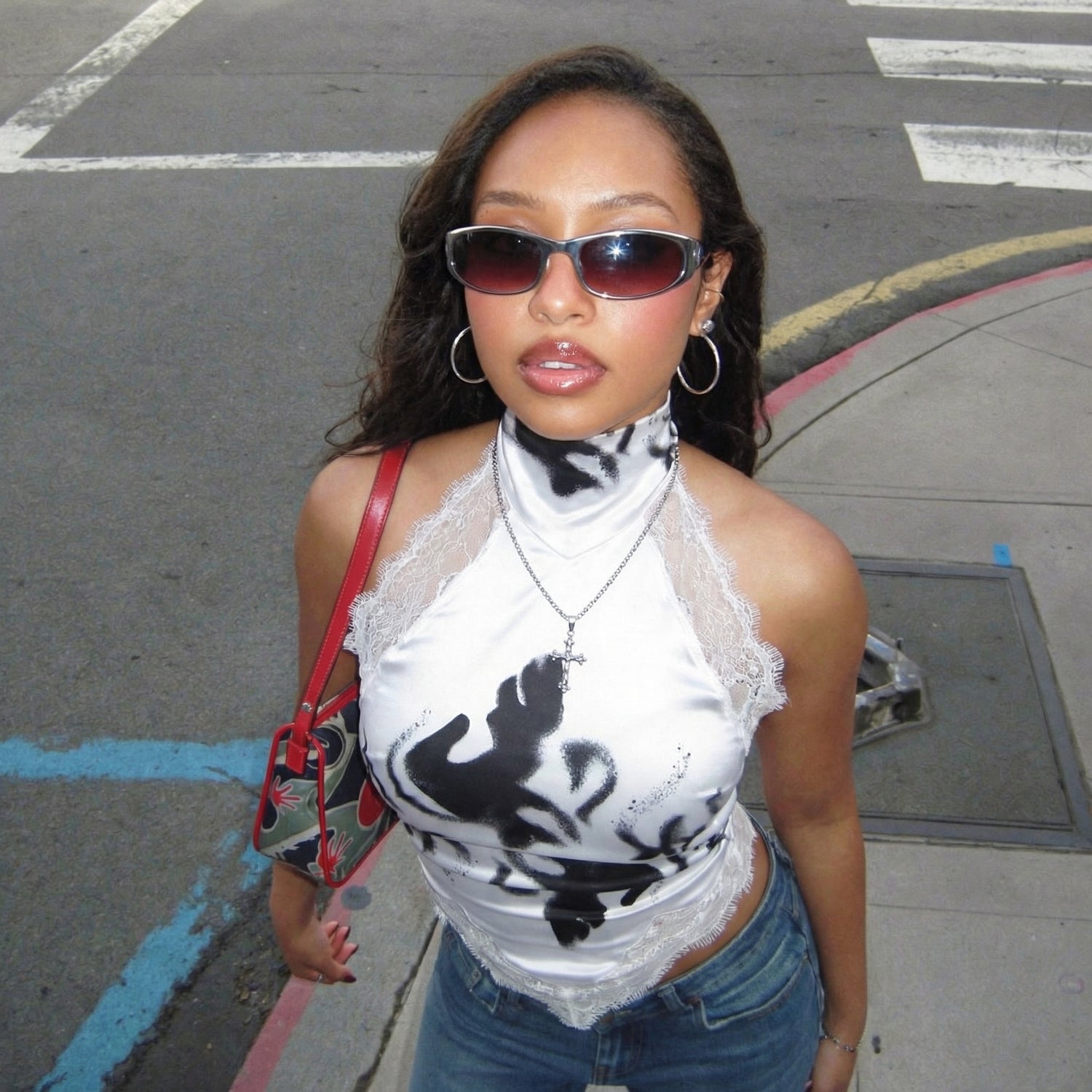 The Digital Era Lace Trim Crop Top features a flattering cropped fit with delicate lace trim for a soft, feminine touch. Perfect for creating effortless Y2K-inspired outfits with a cute and iconic vibe. ♡